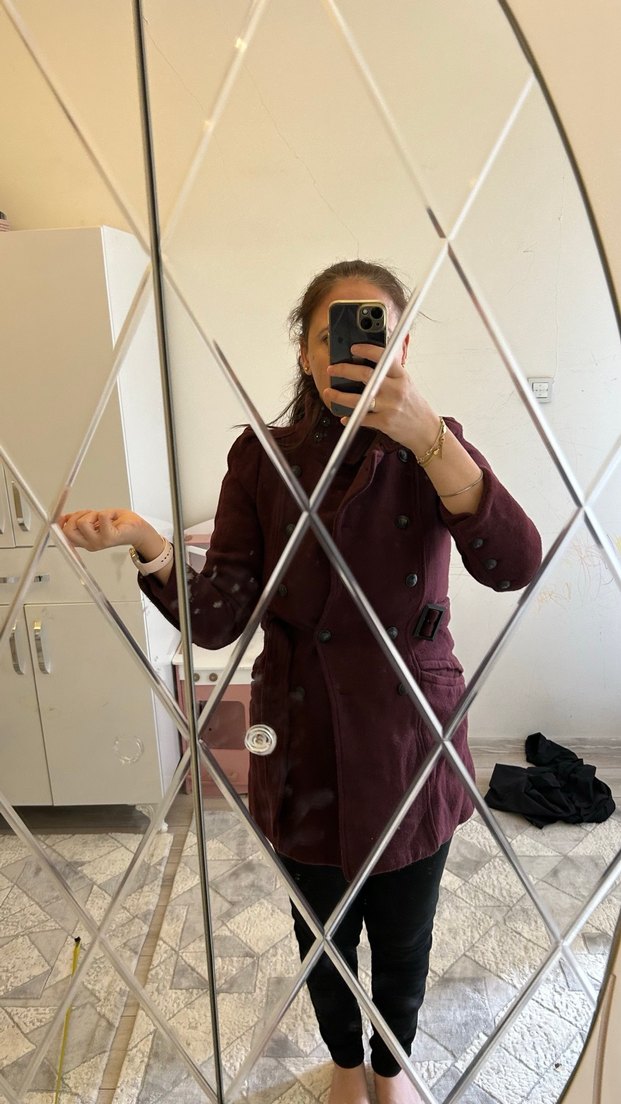 Bordo renkte, kemerli ve kesimli kadın kaban, yakasında kesik yaka bulunur. Gotik tarzda, ofis için uygun, kareli desene sahiptir. Fotoğraftaki gibi olup, yün kaşedir. Defosu veya kusuru yoktur