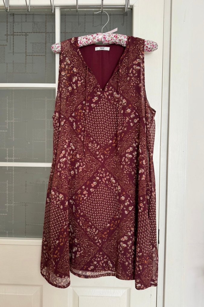 Mango Bordo renkte, kolsuz ve V yaka olan bu bohem elbise, salaş kesimi ve bağlama desenleriyle romantik akşamlar için uygun. Hafif ve dökümlü kumaştan üretilmiştir. M beden #mango#elbise