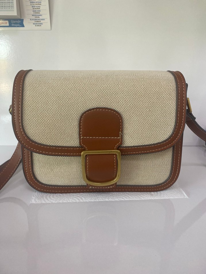 Görüldüğü gibi fotoğraflardan sadece toka kısmında hafif çizilme vardır başka herhangi bir defosu yoktur Bej deri ve kahverengi detaylara sahip, tokalı kemer tasarımıyla modern klasik tarzda kadın çantası, günlük kullanım için uygundur.