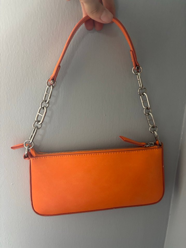 Turuncu deri kadın çanta, zincir detaylı ve minimalist tasarıma sahip. Trendy casual sokak stili için uygun, desensiz ve günlük kullanım için ideal.