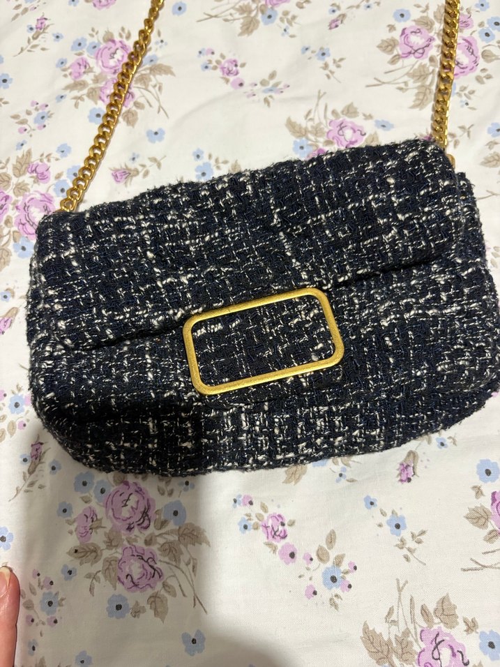 Mango marka channel kumaş lacivert çanta. Boyu; 12cm, eni; 22cm