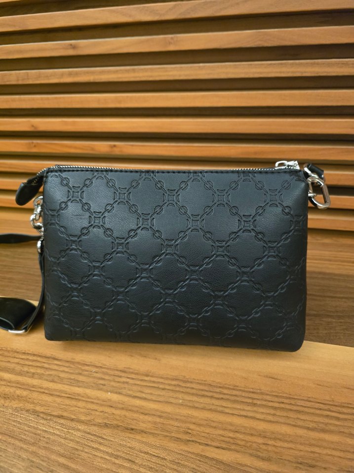 Klasik şıklıkta, tokalı siyah deri kadın çantası. Günlük iş kullanımı için uygundur, desen içermeyen modern tarzda.