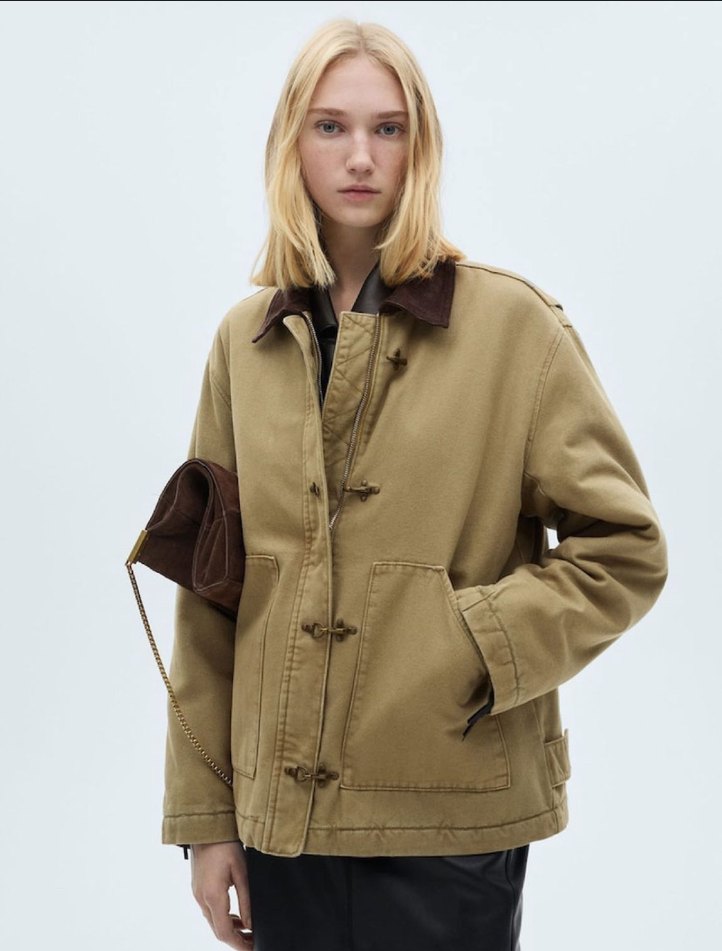 Bej süet kumaştan yapılmış, düğmeli ve kesik yaka detaylı, uzun kollu midi uzunluğunda kadın ceketi. Günlük kullanıma uygun rahat kesim.