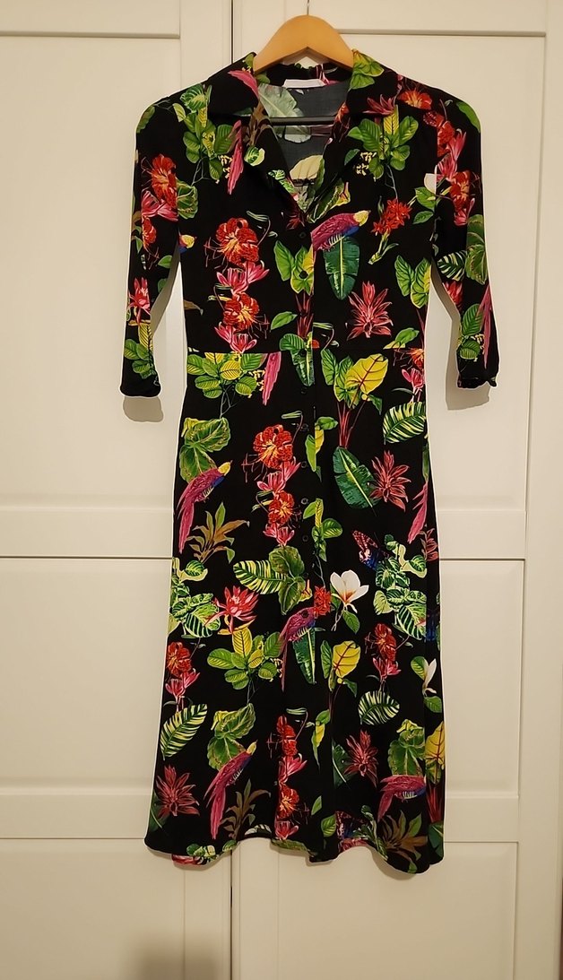 Bu A kesim uzun elbise, siyah renkli zemjn üzerine çok renkli çiçek desenine sahiptir. Dirsek kollu, V yakalı, cepli ve düğmeli olup, yumuşak pamuk kumaştandır. Ürünün tek bir sorunu vardır. O da kolaltından yırtılmış olması terzi görmesi gerekli yahut kollarını tamamen çıkartıp usta bir terzi kalın askılı elbise olarak şekil verebilir. Renkleri capcanlı yepyenidir. Yalnızca birkaç kez kullandım. Başka hiçbir sorunu yoktur. Tertemiz yıkanmış ve ütülenmiş bir şekilde alıcısını bekliyor. Pazarlık payı özellikle sökük olduğu için mevcuttur. (Elbise boyu yaklaşık 105 cm. bel 34 cm. kolaltı 42cm.)