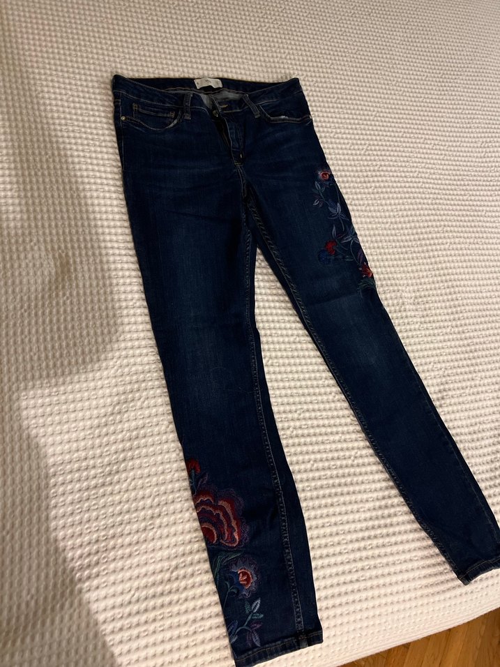 Mango'nun en sevilen koleksiyonlarından biri olan, yan ve paça kısımlarında renkli çiçek nakış detayları bulunan harika bir jean! Koyu lacivert rengiyle hem şık hem de spor kombinlere çok yakışıyor. Nakışları oldukça kaliteli ve canlı durmaktadır. • Durum: Çok temiz ve az kullanıldı. Herhangi bir aşınma, nakışlarda sökülme veya renk solması yoktur. • Beden: Etiketi EUR 42 / USA 10 / MEX 9 bedendir. • Kalıp: Vücudu saran skinny/dar paça modeldir. • Detay: Ön ve arka cepleri mevcuttur. Kumaşı esnektir, gün boyu konfor sağlar. Özellikler: • Marka: Mango (MNG Denim) • Beden: 42 (L) • Renk: Koyu Lacivert • Tarz: Bohem / Romantik / Günlük