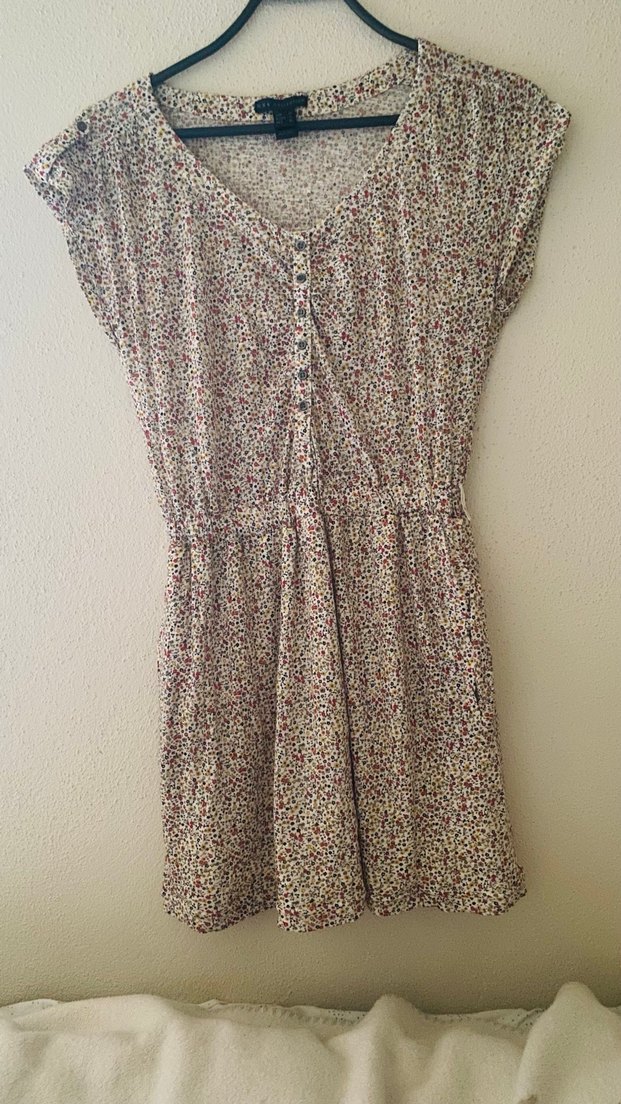Bej renk, V yakalı ve düğmeli midi elbise. Pamuklu, kısa kollu ve bol kesim. Vintage tie-dye desenli, bohem tarzda rahat bir elbise. M beden yazsada S uyumlu.Yepyeni sayılır iadesi yok.