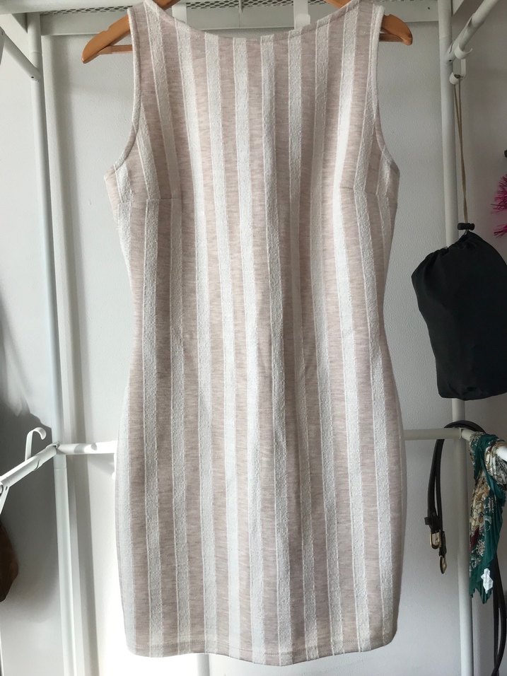 Pudra rengi çizgili elbise. Hiçbir kusuru yok. Mango marka. Pamuklu ürün, terletmez. Vücuda yapışan model.