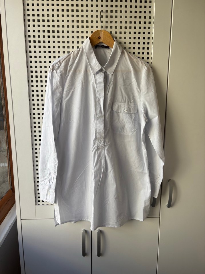 Beyaz pamuklu kadın gömlek, düğmeli ve yakalı, uzun kollu. Rahat kesimli ve sade minimalist tarzıyla günlük kullanıma uygundur. Geniş kalıbı vardır #mango #kadingomlek