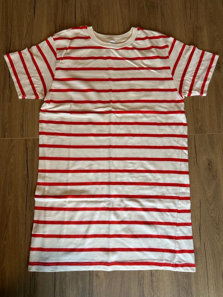 Kısa kollu ve bisiklet yakalı, pamuk kumaştan yapılmış kırmızı çizgili uzun tişört. Hiç kullanılmadı, kenardaki dikişinde yamukluk var aldığımda o şekildeydi, görsellerde mevcut