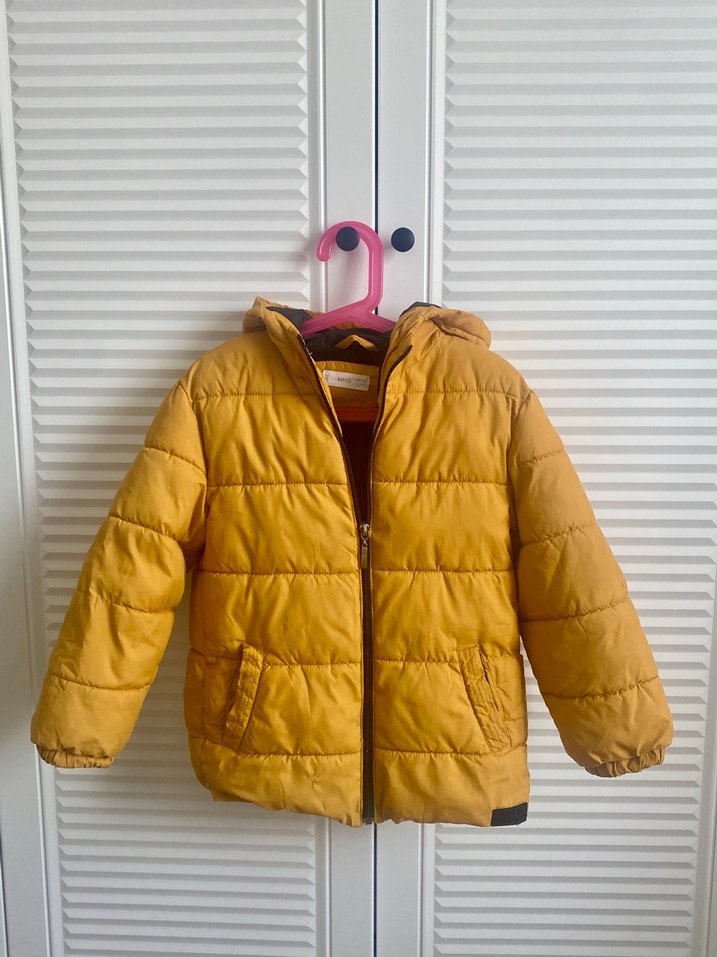 Mango çocuk montu. Sıcacık tutuyor. Uzun süre kullanıldı. Küçük bir kusuru var, fotoğrafını çektim. #mango #mangoçocuk #mont #kaban #7yaş #sarımont
