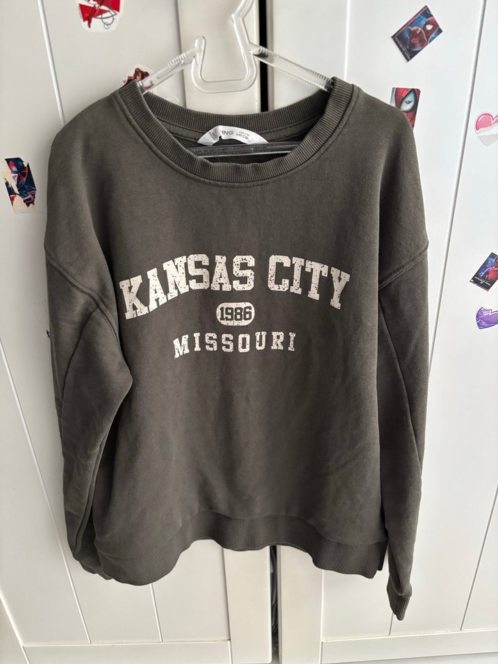Pamuklu gri sweatshirt, uzun kollu ve yuvarlak yakalıdır. Oversize kesim ve 'KANSAS CITY MISSOURI 1986' baskısı ile gündelik rahat şıklık sunar.