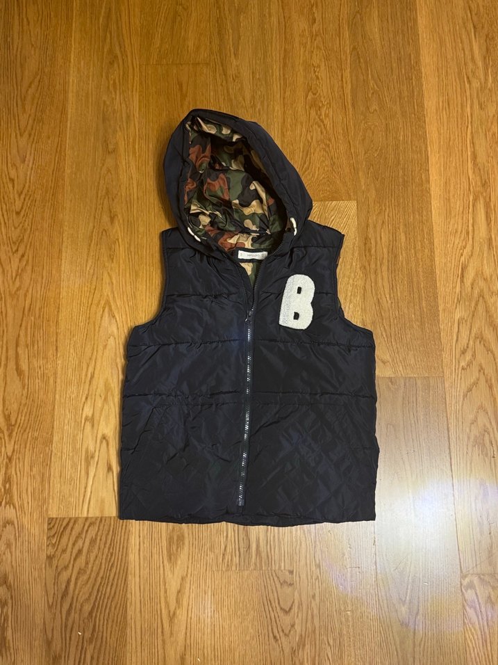 Kapüşonlu ve kamuflaj desenli astarı olan, düğmeli, fitted kesim ve koyu kahverengi erkek çocuk yeleği. Yumuşak ve sıcak kumaştan üretilmiştir.