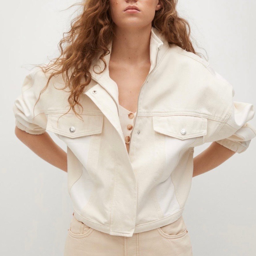 Mango kontrast parça detaylı ceket. Xsmall beden. Ekru- beyaz parçalı. %100 pamuk. Crop kısa ve geniş model. Omuzları düşük dik yakalı. Uzun kollu ve manşetli. Göğsü kapaklı iki cepli. Önü fermuarlı ve çıtçıt kapaklı. Etiketli, sıfır, kullanılmamış. Teniz ve hasarsızdır. Detaylar için resmi kaydırın