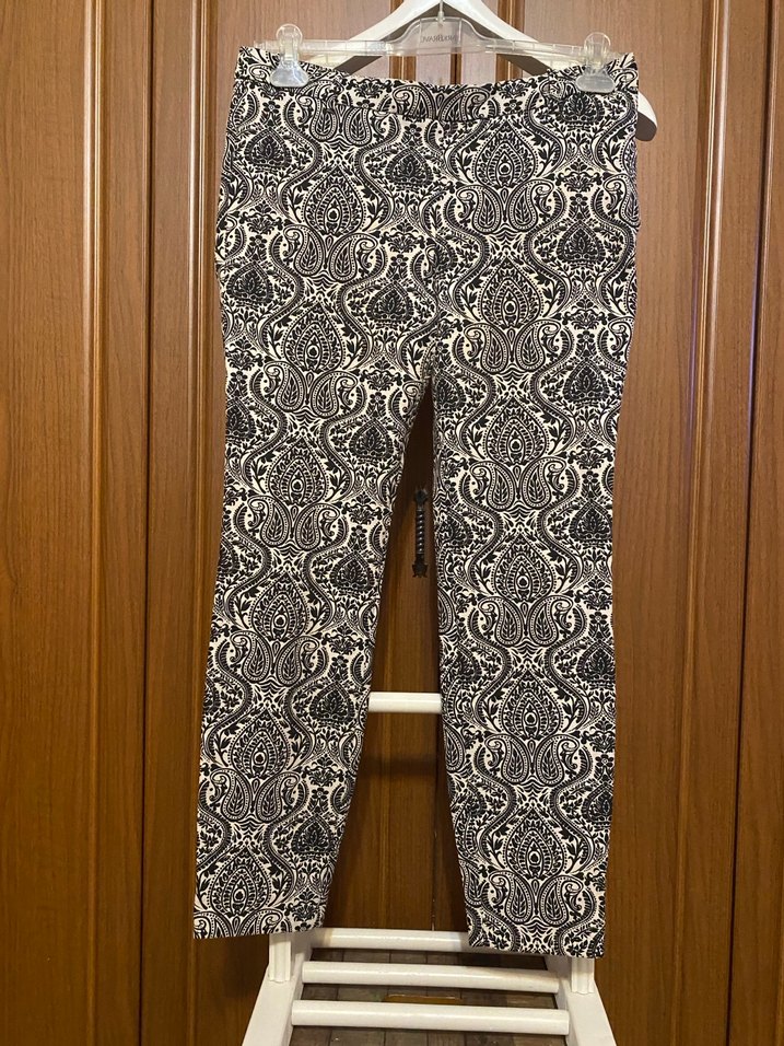 Mango marka, siyah- krem damask desenli, pamuklu kumaştan tayt rahatlığında pantolon. Fermuarı yandan, havuç paça model, belinde kemer briti detayları var. L beden, ölçüleri fotolarda mevcuttur.