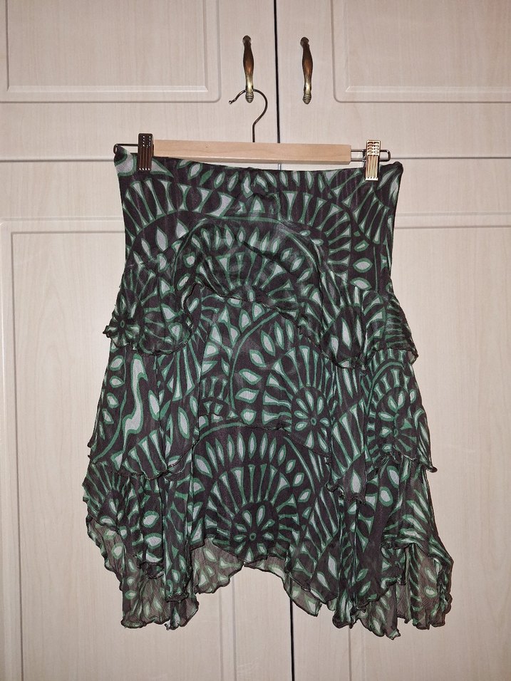 Mango S beden orijinal içi astarlı, fırfırlı şifon etek. Bel lastikli. Yarıda bel 36 cm, en kısa yerden boy 47 cm, en uzun yerden boy 55 cm. Defo yok. Giyilmedi