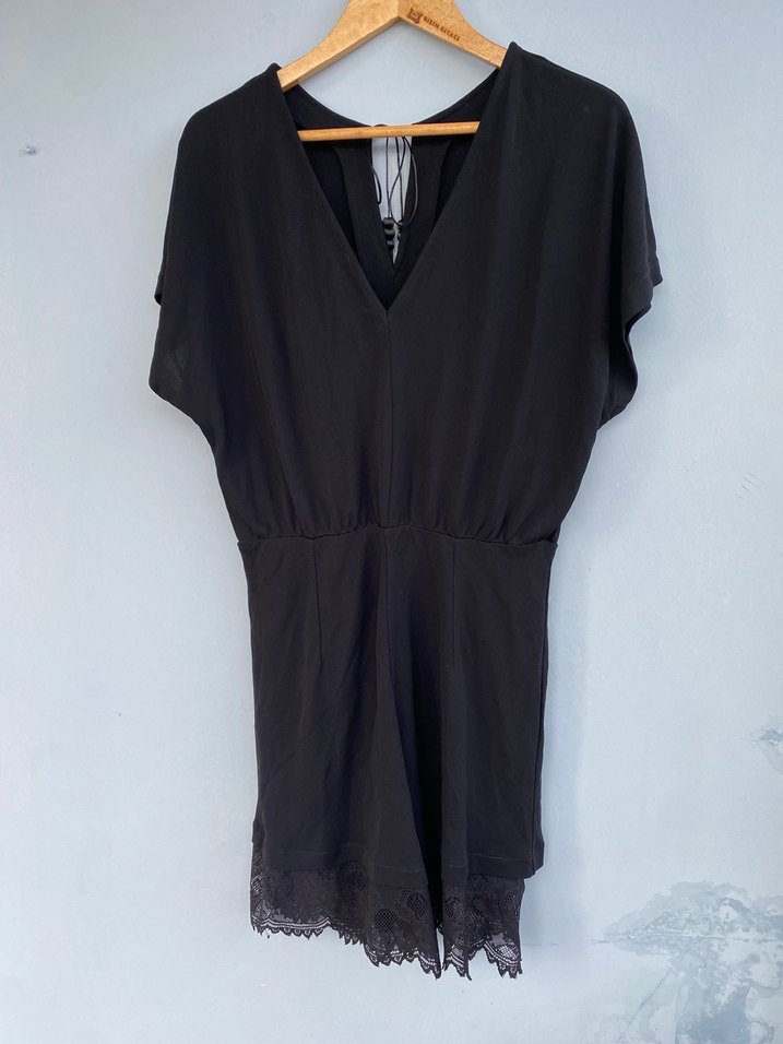 V yakalı, kısa kollu, bol kesim siyah kadın tulum. İpeksi kumaş ve drapeli tasarım, uç kısmında dantel detaylı, romantik akşamlar için uygun. Hiç giymedim hatası yoktur.tiril tiril bir kumaş,şort ıçları dantellidir.ön arka v yakasfır,yaka açılmaması için bağlama datyı vardır,bel lastiklidir.inanılmaz rahat sanki üzeriniDe birşey yokmus gibi tam yazlık✌