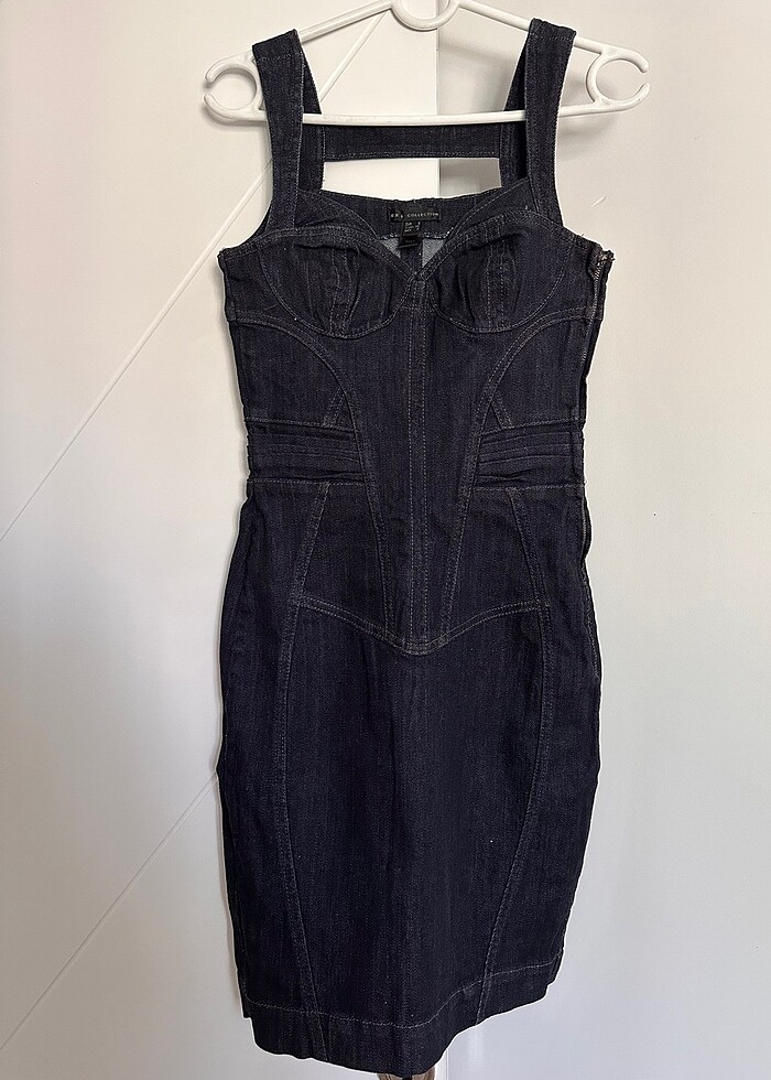 Tertemiz, koyu renk denim S beden, dizin birkaç parmak üstünde biten mini elbise. Arkasında da yırtmacı var. Göğüs dekoltesi var. İyi günlerde kullanmanız dileğiyle