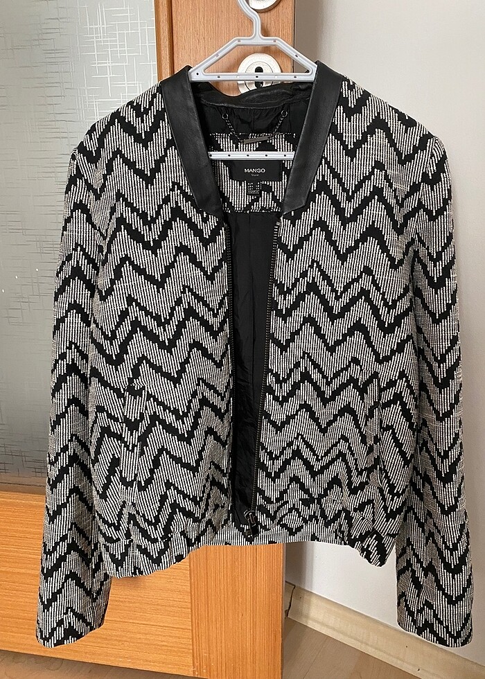Small beden, yakasında deri detayları olan siyah ceket. Tok bir kumaşı var. Birkaç kez giyildi, hiçbir deformasyonu yoktur.