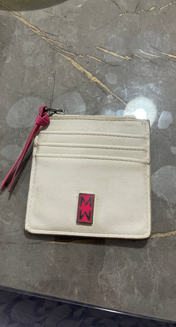 Beyaz deri kadın cüzdanı, fermuarlı kapama ve çoklu kart bölmeleri içerir. Minimalist tasarımlı ve hafif baskılı logolu, günlük kullanıma uygundur.