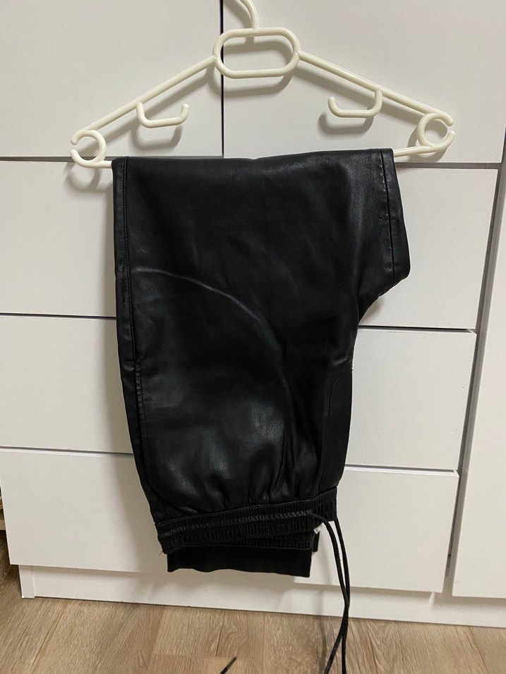 Siyah deri kadın pantolon. Çok rahat ve kullanışlı. En son fotoğrafta görebileceğiniz minik bir soyulma var fakat iç bacak kısmında olduğu için giyince belli olmuyor.