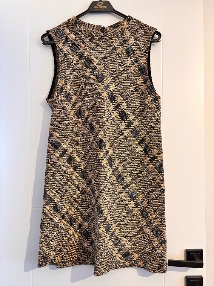 Mango marka, desenli, kolsuz, midi boy triko elbise. L beden. Yüksek yakalı ve regular fit, günlük kullanıma uygundur. İki koltuk arası 48cm, omuzdan itibaren uzunluğu 87cm. Hasarsız ve temiz bir üründür