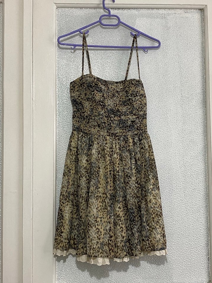 Dantel detaylı, yılan desenli, ince askılı ve straplez yakalı kahverengi mini elbise. Bohem ve retro tarzları için uygun, parti kıyafeti.