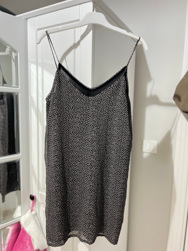 Bu askısız mini elbise, siyah ve gri yılan desenli, V yakalı ve bol kesimdir. Rahat ve şık bir günlük stil sunar.