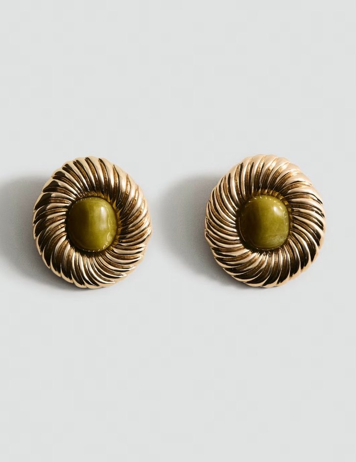 Düğmeli, parlak haki detaylı vintage midi küpeler, romantik akşamlar için uygun.
