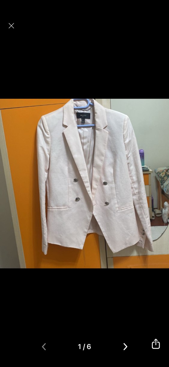 Beyaz pamuklu kumaştan yapılmış, düğmeli ve kesik yaka detaylı kadın blazer cekettir. Uzun kollu ve normal kesimdir, ofis için uygundur.