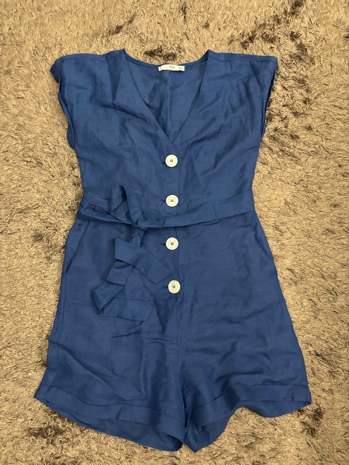 Mavi renkte, keten kumaştan yapılmış, düğmeli ve kolsuz kadın tulumu. Notlu yakası ve bol kesimiyle rahat ve bohem tarzda, günlük kullanım için uygundur.