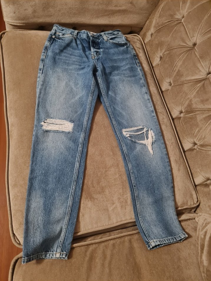 Mavi denim kadın kot pantolon, rahat kesim ve normal midi boy. Yıpranmış detaylarla trend sokak stili sağlar. Günlük kullanım için uygundur. Ölçülü fotoğraflarını paylaştım.Kumaşı elastik değildir.