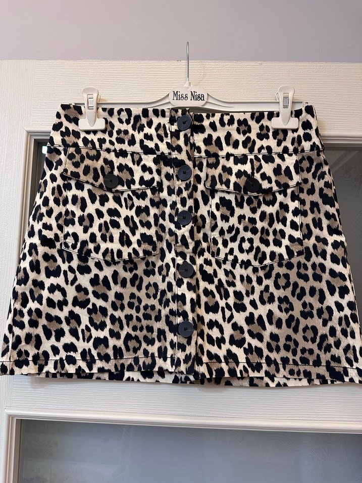 Düğmeli, leopar desenli kısa mini etek, hem spor hem şık tarzda kombin yapılabilir temiz ürün