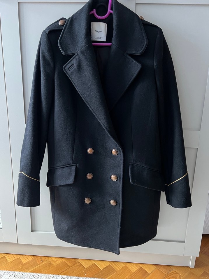 Düğmeli çift sıra düğmeli, kollarında altın detaylı siyah kaban. Yapılı yaka ve iki ön cep bulunur.