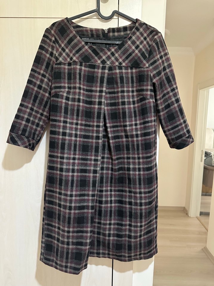 m beden astarlı cepli yün kumaştan, bordo siyah ve gri ekose desenli, ofis için uygun