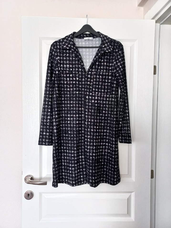 mango polyester kumaşlı elbise tunik olarak da kullanılır. kusuru yok. Iki omuz arası 41 cm Iki koltuk arası 49 cm Boy 88 cm Kol boyu 59 cm