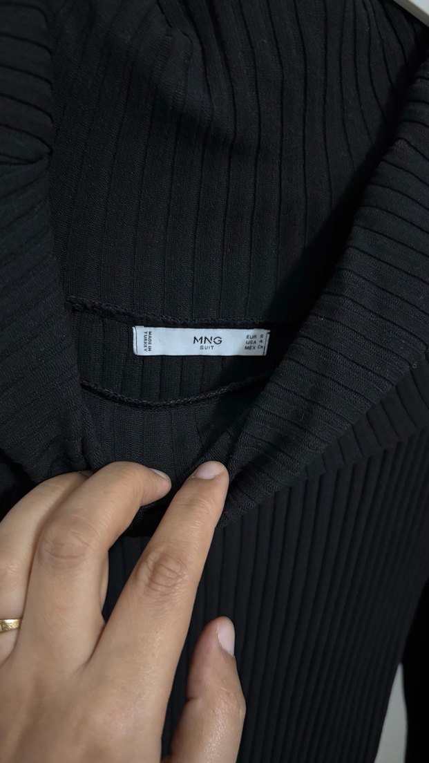 uzun kollu ve siyah renkte . Notlu yaka ve sentetik kumaştan, minimalist ofis tarzı. Marka: MNG. Boydan elbise vücudu saran güzel yumuşak bir kumaşı vardır