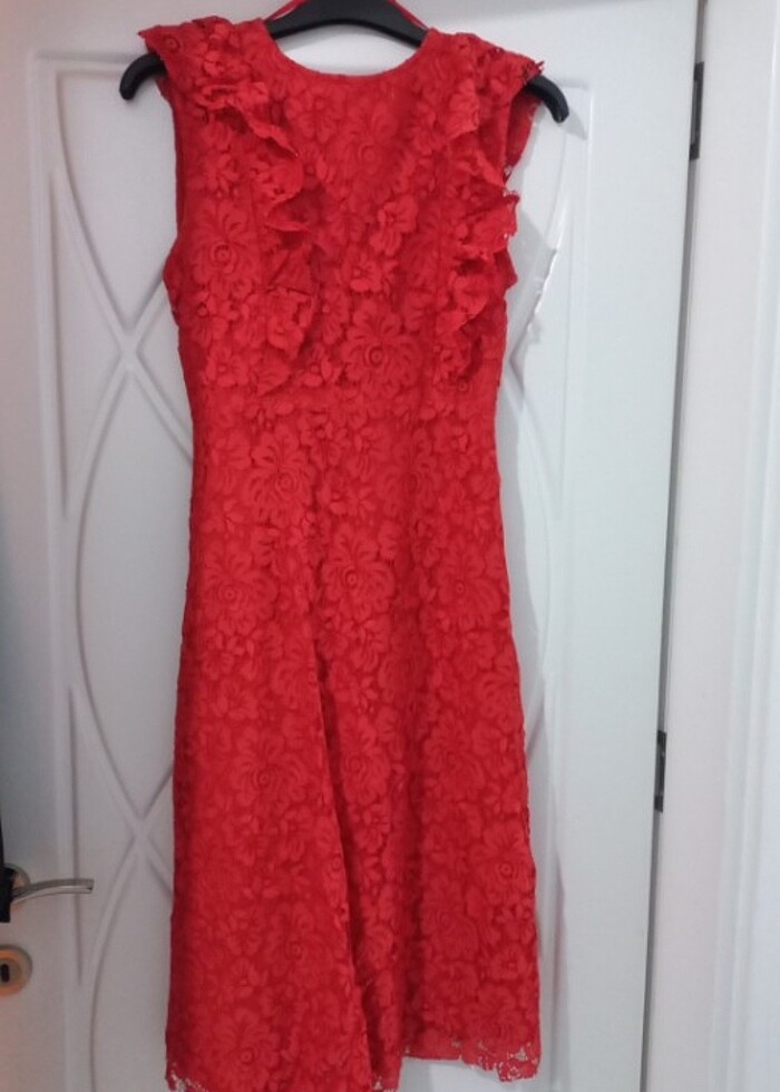 Kirmizi A kesim midi boy elbise bir kere istemede giyildi