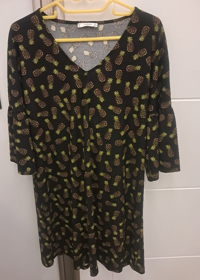 Dökümlü jarse kumaş, siyah zemin üzeri desenli, etek ucuna kadar düz kesim inen Mango elbise. Kolları hareketli, dirsek altında bitiyor. Elbisenin boyu omuzdan itibaren 87 cm. Bedeni (L) beden. Etiketi mevcut değil.Hıç giyilmedi.