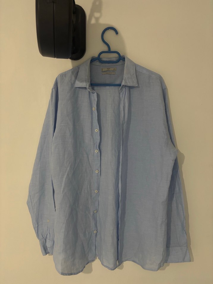 Pastel mavi renkte, keten kumaştan erkek gömlek. Düğmeli ön kısmı, yakalı ve uzun kollu. Hiçbir sorunu yok, temiz ürün.