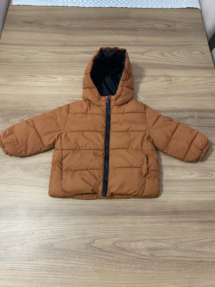 Kahverengi, kapüşonlu ve yumuşak dokulu erkek çocuk montu, sade ve şehir stili için uygun bir tasarıma sahiptir.