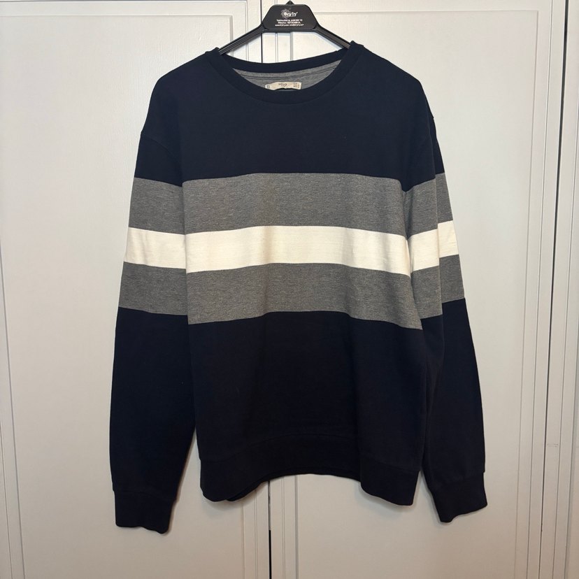 Mango erkek sweatshirt. Large beden. Lacivert renk, beyaz gri çizgili. %100 pamuk kumaş, uzun kollu, bisiklet yaka, bilekleri ve beli ribanalı.Sayılı kullaılmıştır. Kullanımı dışında herhangi bir kusuru, defosu yoktur, temizdir. Detaylar için resmi kaydırın