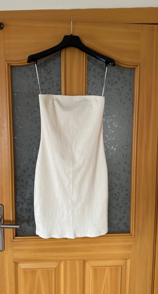 Ekru renk, pamuk içerikli etiketli, defosuz elbise. Mango marka, m beden, straplez elbise.