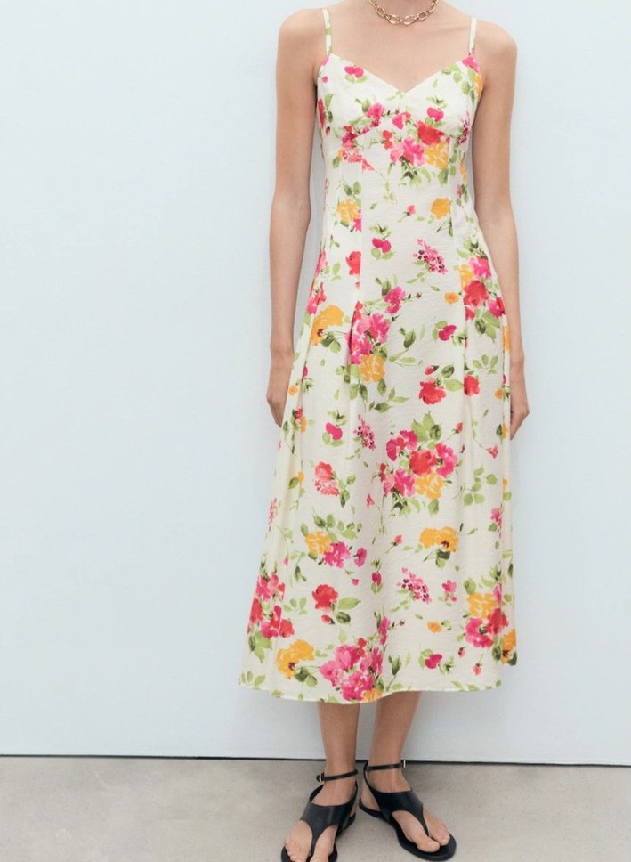 Uzun A kesim tasarım. Çiçek desenli. Dekolteli yaka. Kolsuz. İnce askılar. Ön pile detayı. Yan fermuar kapama.viskoz kumaş hiç giyilmedi etiketli