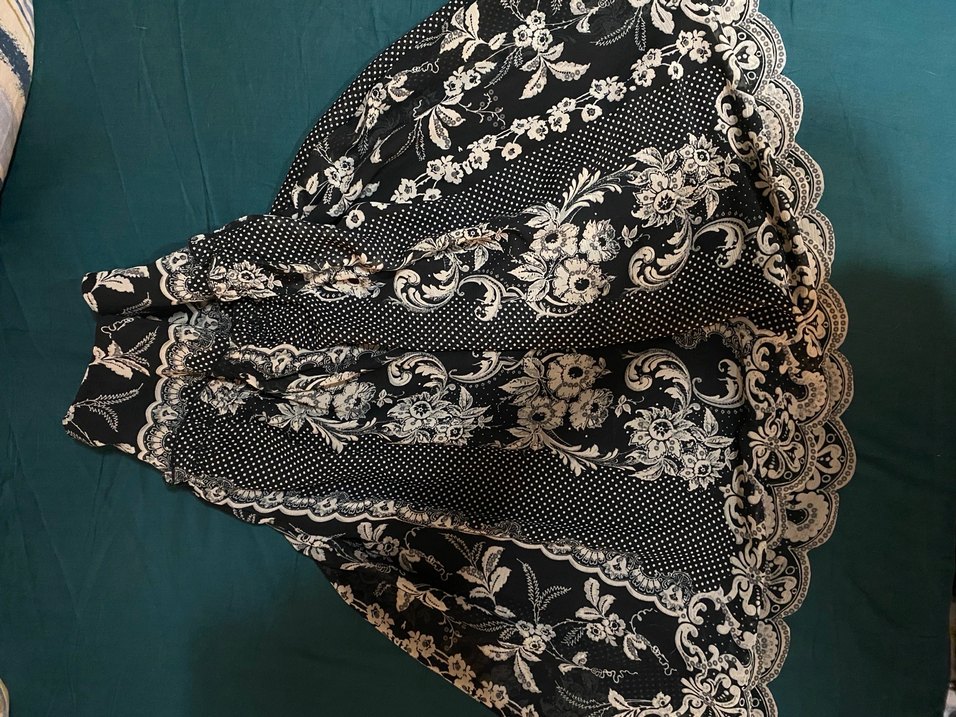 Mango Fairycore Y2K Siyah Desenli Şifon Etek, siyah astara sahip ve belden fermuarlı. Fotoğraflarda ölçüleri bulabilirsiniz.