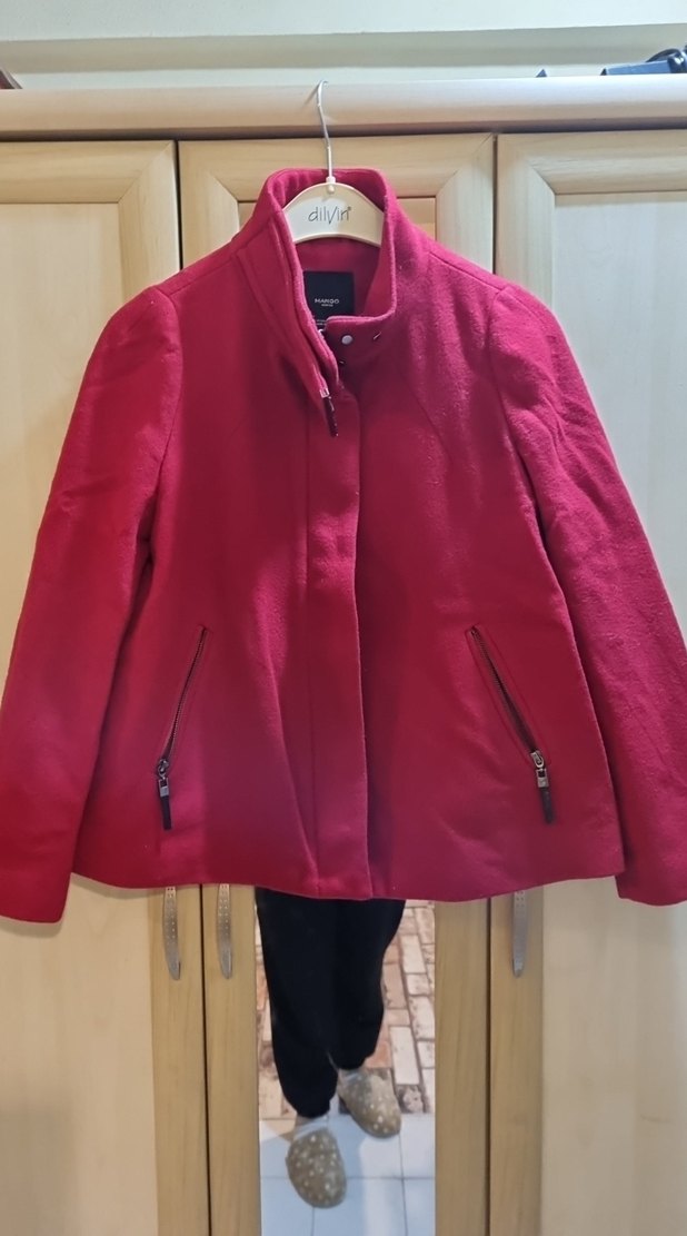 Fermuarlı cepleri ve dik yaka detayıyla kırmızı kaban, soğuk havalar için sıcak ve şık bir dış giyimdir. saf yüzdür 34-36 beden sorunsuz kırmızı bordo arası bir renk