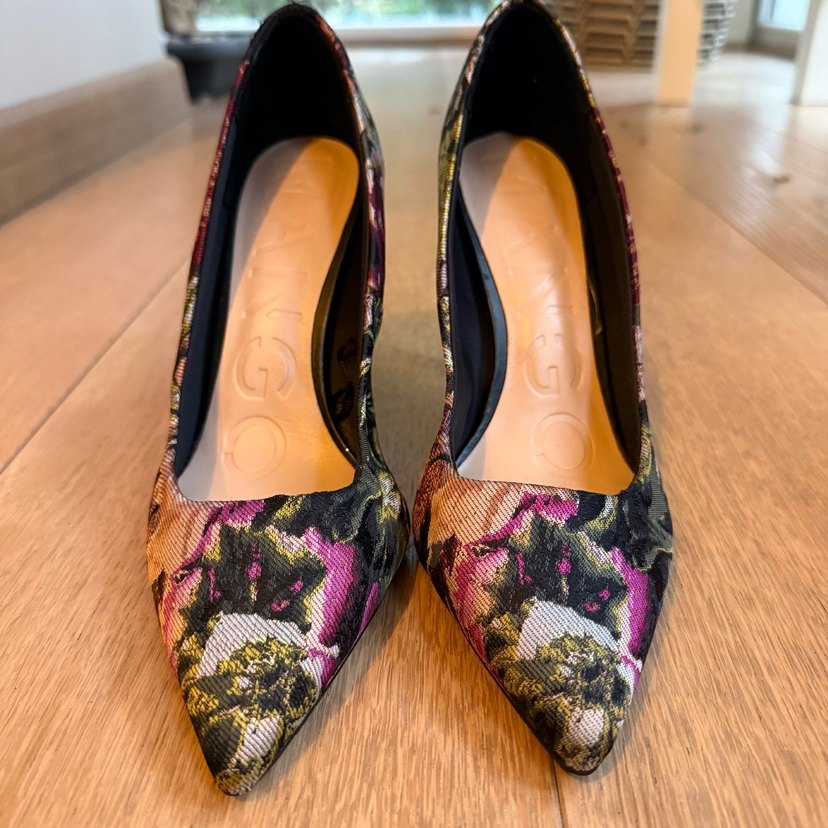 İnce topuk - Sivri uçlu - Kumaş - Topuk boyu 10cm. Hiç giyilmemiştir