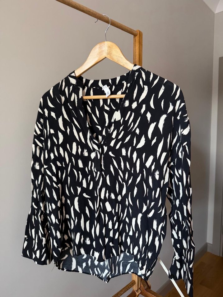 Bu siyah kadın gömleği desenli, V yakalı ve uzun kolludur. Rahat kesimdir.