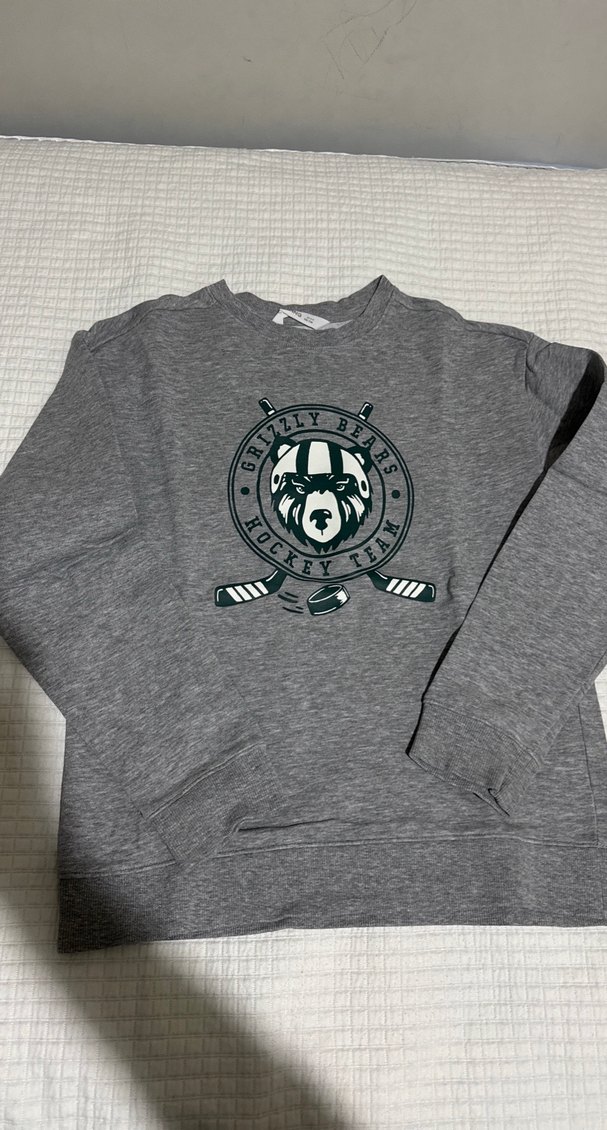 Gri uzun kollu sweatshirt, yuvarlak yaka ve baskılı Grizzly Bears Hockey Team logosuna sahiptir. Rahat kesim ve yumuşak, sıcak kumaştandır. 11/12 yaş çok az giyildi