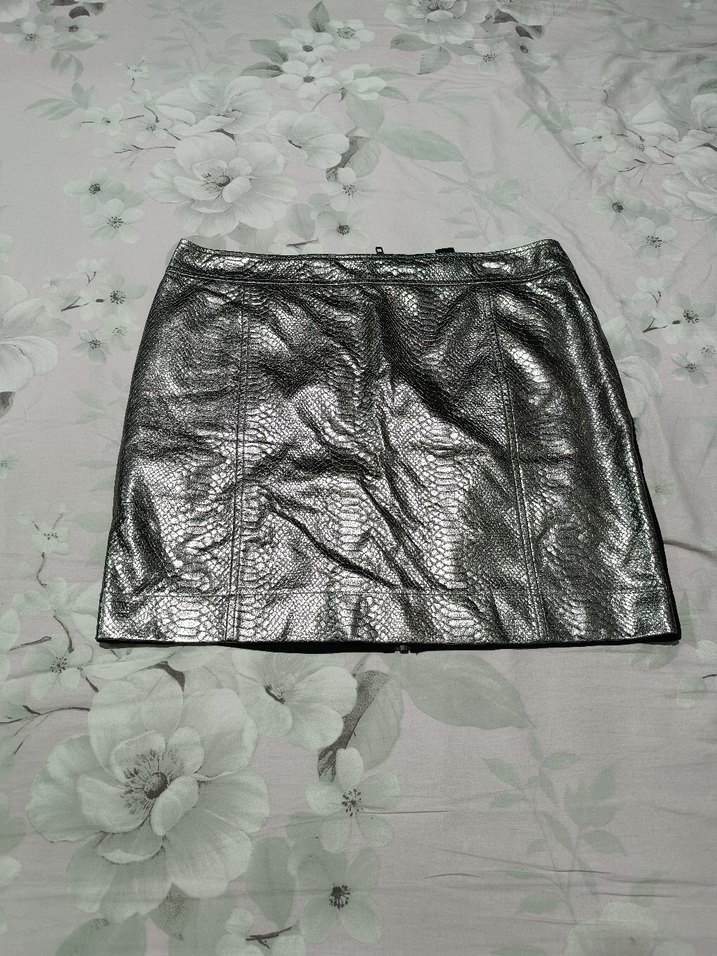 Gri deri yılan desenli mini etek, beli kemerli ve vücuda oturan kesime sahip. Sokak modası ve avangart tarzlar için uygun. sayılı giyildi