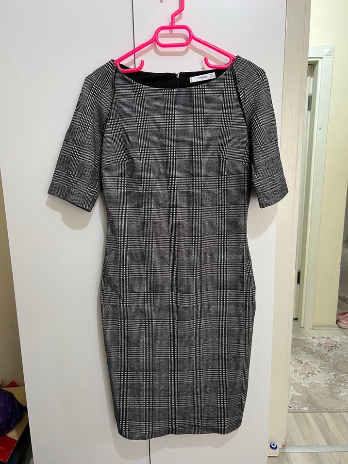 Mango Gri kareli midi kalem elbise, kısa kollu ve tekne yaka detaylarına sahiptir. Normal kesim ve pileli detaylarıyla ofis kullanımı için uygundur.